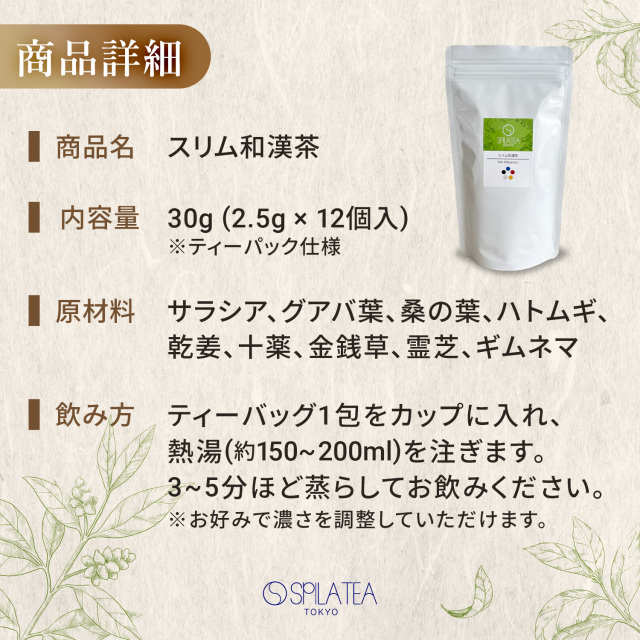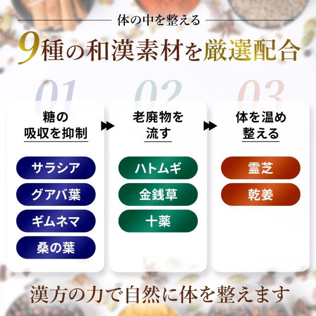 サラシア、グアバ葉、桑の葉、ハトムギ、乾姜、十薬、金銭草、霊芝、ギムネマ