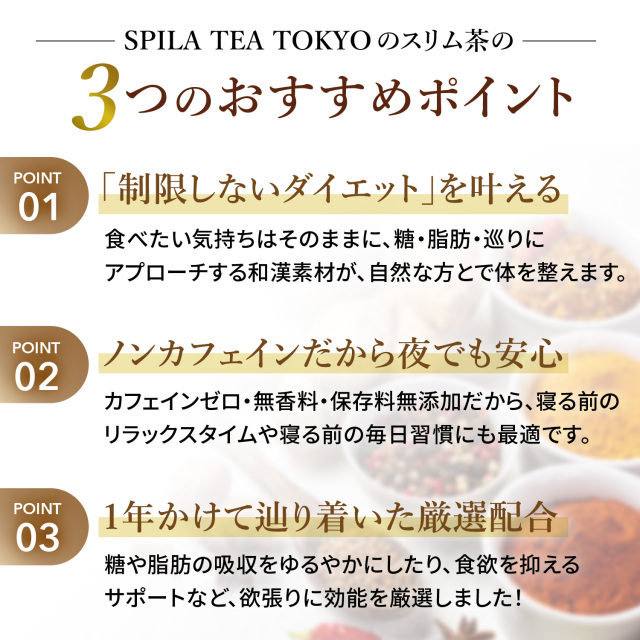 サラシア、グアバ葉、ギムネマなど、日々のリズムをすっきりサポートする素材をたっぷり使用。ノンカフェインで無添加。